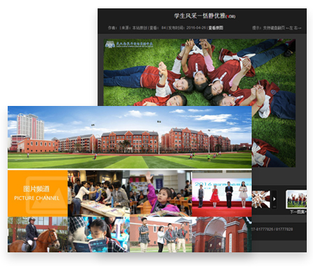 首頁首屏采用滾動大圖的形式,展示校園環(huán)境、課堂教學等圖片內(nèi)容,不僅使網(wǎng)站界面整體上清新高雅、大氣美觀,具有強烈的動態(tài)美感,而且大圖作為網(wǎng)站的一種有效的宣傳方式,作為網(wǎng)站的直接視覺元素,可以有效地吸引用戶的注意力,突出學?,F(xiàn)代化、國際化學校辦學特色。