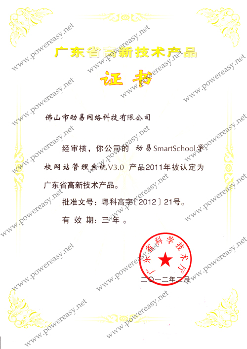 廣東省自主創(chuàng)新產(chǎn)品認(rèn)定證書 動易SmartSchool V3.0