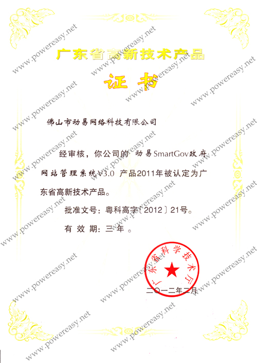 廣東省自主創(chuàng)新產(chǎn)品認(rèn)定證書 動易SmartGov V3.0