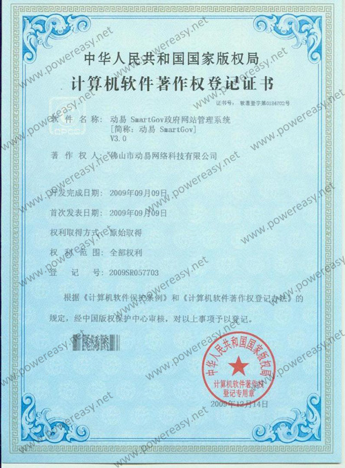 軟件產(chǎn)品登記證書 動易SmartGov政府網(wǎng)站管理系統(tǒng)V3.0