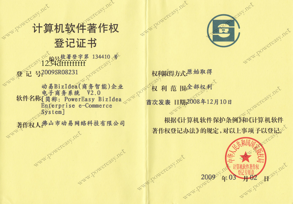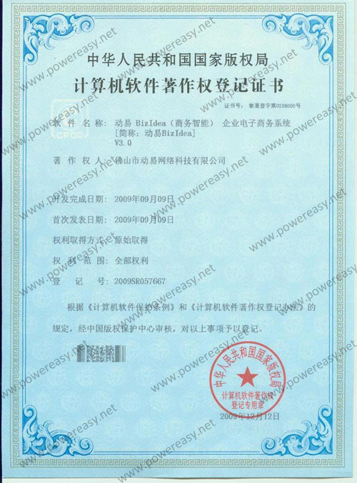 軟件產(chǎn)品登記證書 動易BizIdea企業(yè)電子商務(wù)系統(tǒng)V3.0