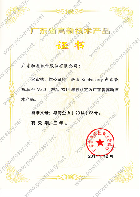 2010年廣東省高新技術(shù)產(chǎn)品 (SiteFactory)證書