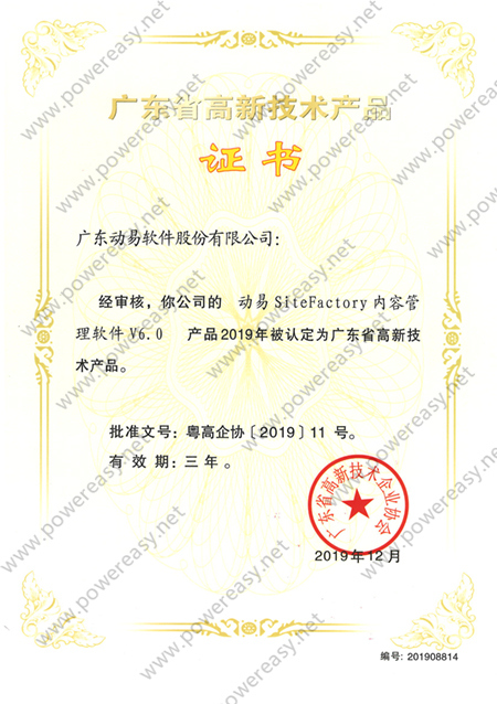 廣東省自主創(chuàng)新產(chǎn)品認(rèn)定證書 動易SiteFactory V3.0