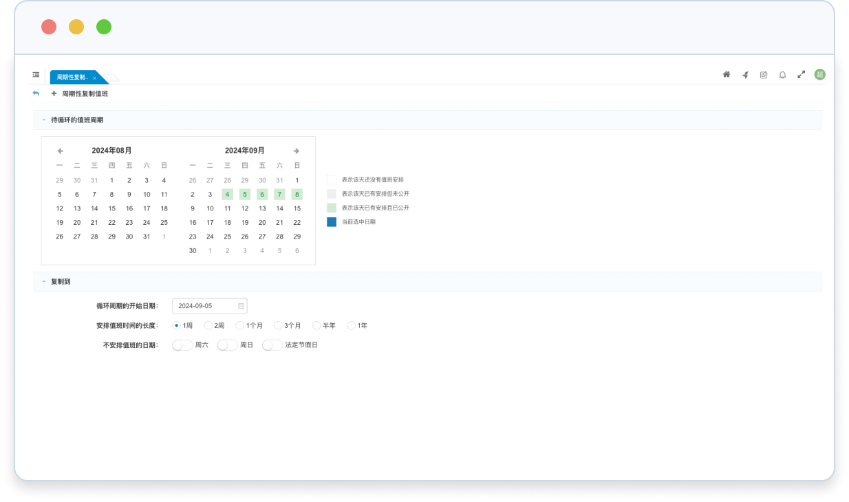 - 支持按周期復(fù)制值班功能,可快速的安排好未來(lái)一段時(shí)間的值班。