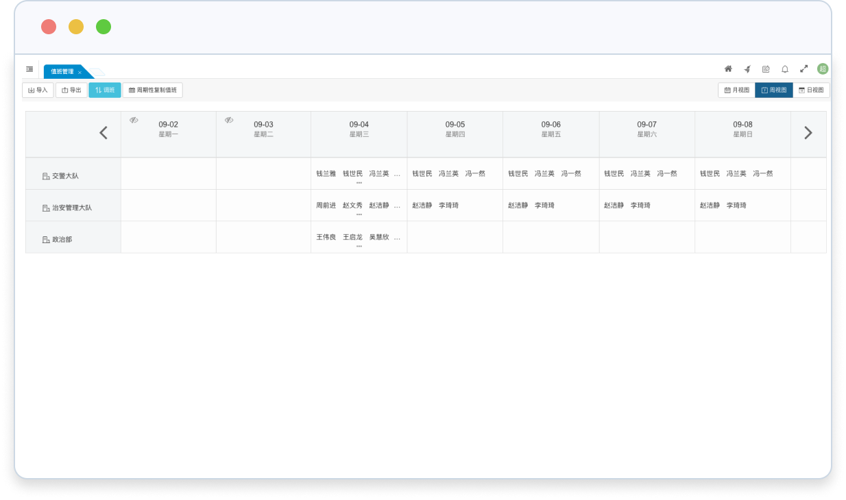 - 支持按日視圖、月視圖模式和周視圖模式對(duì)值班信息進(jìn)行管理,不同視圖適用于不同值班人員規(guī)模的排班需求。