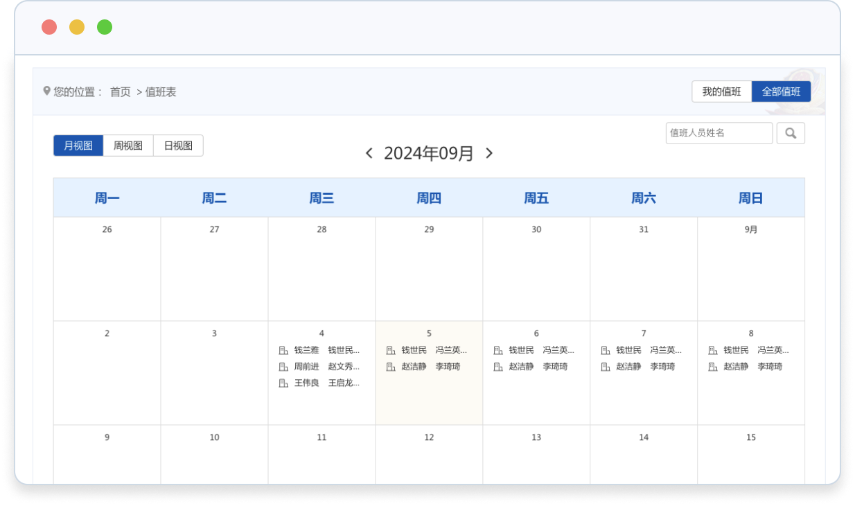 - 值班信息列表頁(yè)與后臺(tái)相同,提供月視圖模式來(lái)顯示每月的值班信息,提供周視圖模式來(lái)展示每周的值班信息,提供日視圖來(lái)查看指定日期的值班表,并且支持在月視圖、周視圖、日視圖之間自由切換。用戶還可以從月視圖或周視圖中點(diǎn)擊查看特定日期的值班表,支持按人名搜索值班安排,且能夠同時(shí)搜索多個(gè)人。