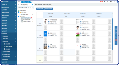 中欄為本次招生考試項(xiàng)目的班級(jí)列表,每個(gè)班級(jí)名稱后顯示相應(yīng)的進(jìn)入面試流程的考生總數(shù),假如有“待安排面試時(shí)間”的考生,則用紅點(diǎn)進(jìn)行提醒。右側(cè)為待安排面試考生列表,中間為面試日程安排表。
