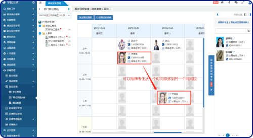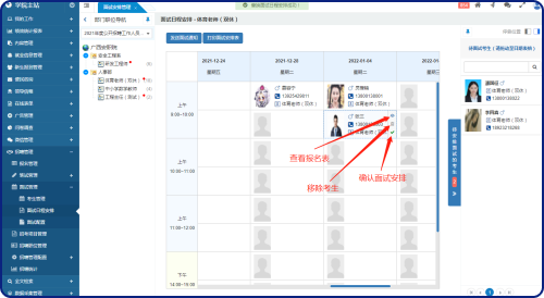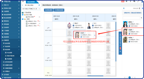 在這個(gè)面試日程安排界面中,可以將“待安排考生”拖拽到未安排面試的時(shí)間段的單元格中;可以拖拽考生從一個(gè)時(shí)間段到另一個(gè)時(shí)間段;假如一個(gè)時(shí)間段里有多個(gè)考生,可以拖拽考生進(jìn)行排序;已安排好的考生,可以移除以重新安排。