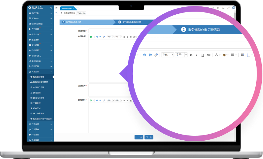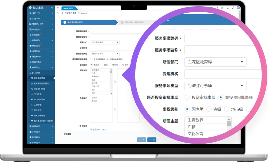 網(wǎng)上辦事系統(tǒng)主要用于在網(wǎng)站群平臺展示并處理各類行政審批服務(wù)事項(xiàng),為用戶提供一個(gè)便捷的在線服務(wù)平臺。