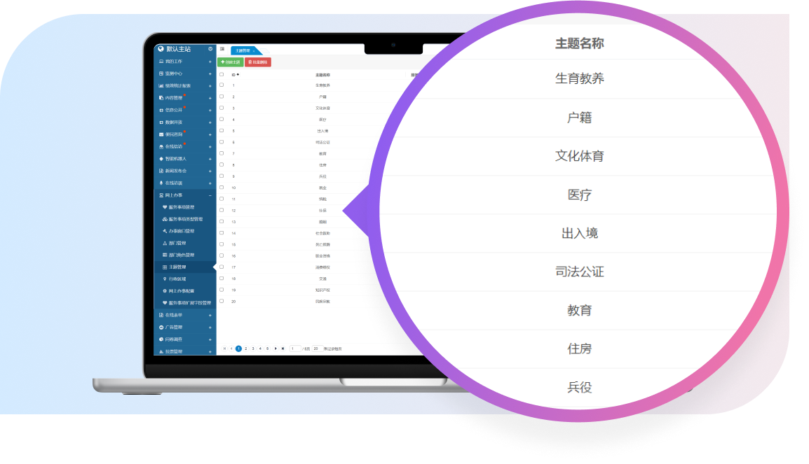 該系統(tǒng)集成了多個(gè)核心功能子模塊,包括服務(wù)事項(xiàng)管理、辦事窗口管理、部門管理、主題管理、行政區(qū)域管理等功能子模塊。