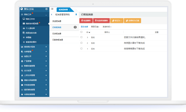 可以查看、標記并管理發(fā)送給管理員的短消息,同時支持回復消息及向其他管理員發(fā)送短消息。