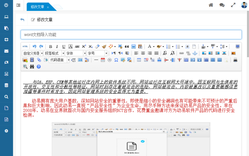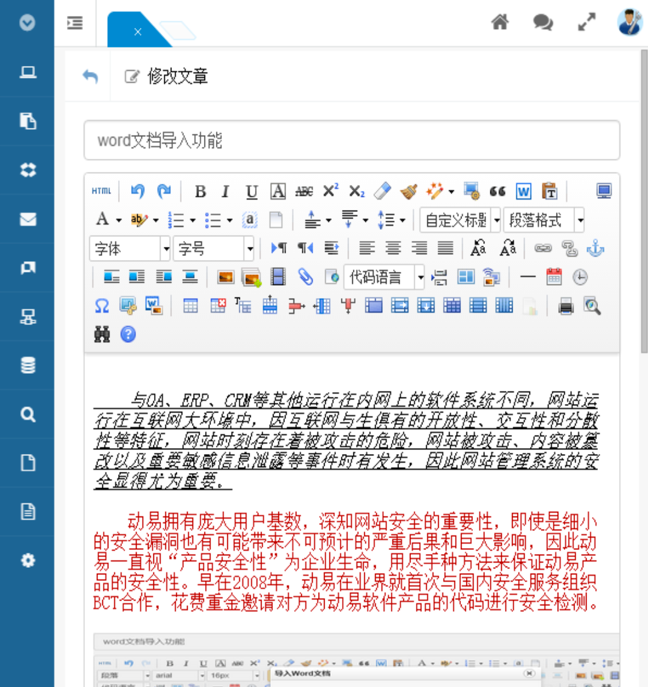 此外,動易SiteAzure 還對一些大型控件進(jìn)行了選型和完善,如全新升級的內(nèi)容編輯器,在保持原有編輯器功能的基礎(chǔ)上,加入了 Word 文檔直接導(dǎo)入、一鍵格式化紅頭文件、三屏無縫內(nèi)容輸入等功能;再如可視化圖表控件,直觀,生動,可交互,支持折線圖(區(qū)域圖)、柱狀圖(條狀圖)、餅圖(環(huán)形圖)等常見圖表類型。