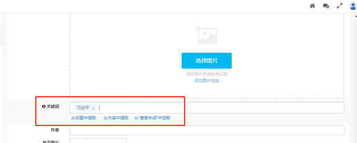 為了操作方便,系統(tǒng)還提供了三種方式來自動提取關鍵詞:從標題中提取、從內容中提取、從“搜索熱詞中選取”。