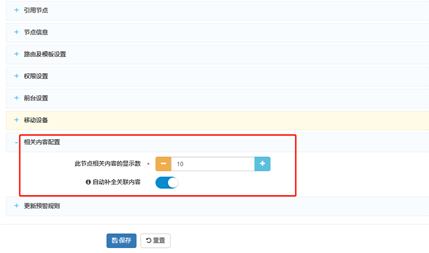 系統(tǒng)提供了“相關內容補全”功能。開啟這個功能后,當手工設置的相關內容數量達不到在此節(jié)點相關內容的顯示數,或沒有手工設置相關內容時,系統(tǒng)自動通過全文檢索功能找到包含了在“關鍵詞”字段中設置的關鍵詞內容,并填充到相關內容列表中,以盡量保證足額顯示相關內容。