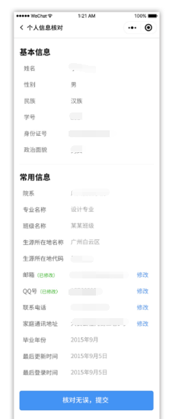 畢業(yè)生對(duì)本人信息進(jìn)行核對(duì),如信息有誤可在小程序中修改并提交,并由院系用戶或輔導(dǎo)員(管理員)進(jìn)行數(shù)據(jù)審核。