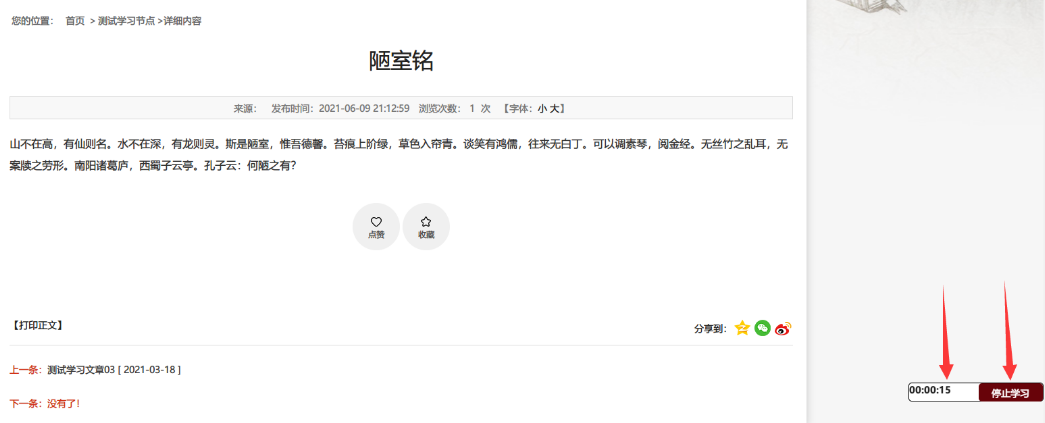 系統(tǒng)在學習資料中引入了一個“學習時長”的概念,比如5000字的文章,設定了學習時長是8分鐘,學習者需要在學習資料中停留足夠的時間,才能算是“學習完了"。