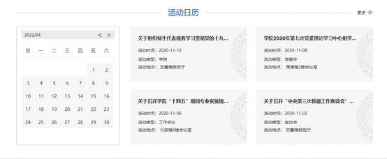 日歷日期鏈接學(xué)院所有活動(dòng),以直觀的表現(xiàn)形式介紹活動(dòng)時(shí)間及情況。同時(shí)采用時(shí)間軸的形式回顧活動(dòng),可以讓訪問者快速便捷的訪問以往相關(guān)活動(dòng)信息。