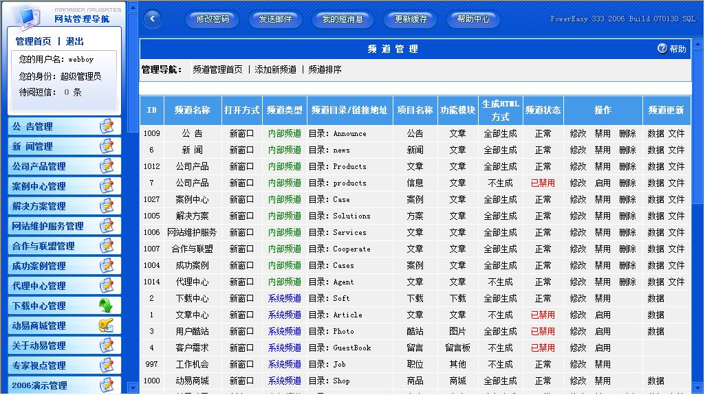 我們先看一下動(dòng)易2006版的后臺(tái)界面。下圖是動(dòng)易官方網(wǎng)站使用的動(dòng)易2006版后臺(tái)界面