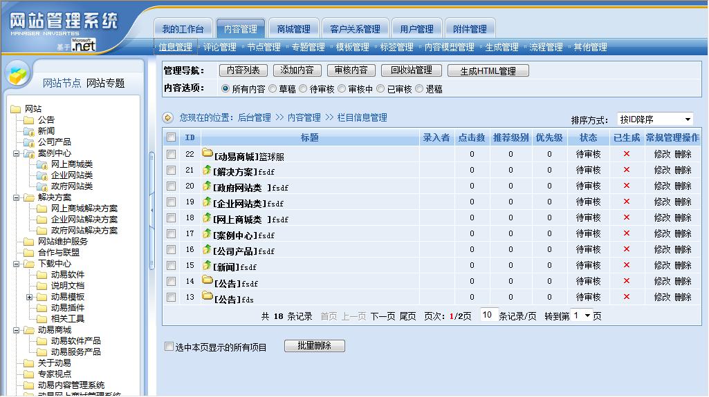動(dòng)易SiteFactory 版后臺(tái)界面——內(nèi)容管理(點(diǎn)擊可查看原圖)