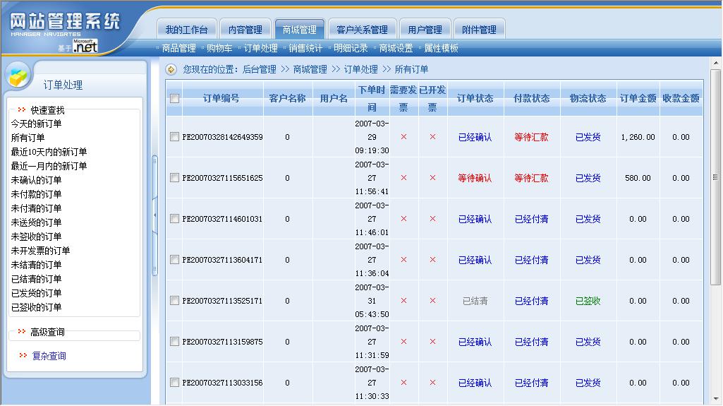動(dòng)易SiteFactory 版后臺(tái)界面——訂單處理(點(diǎn)擊可查看原圖)