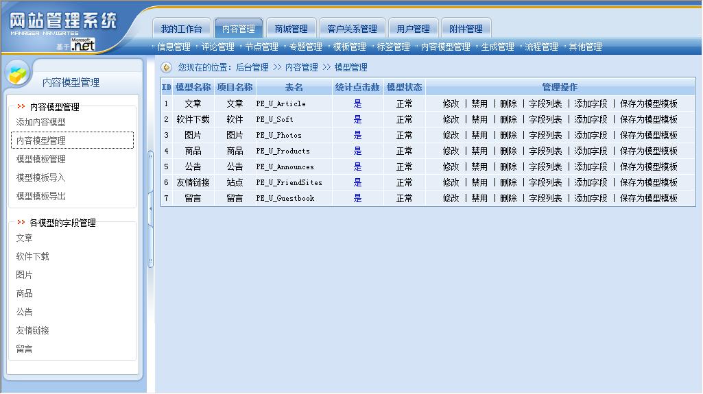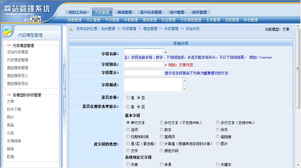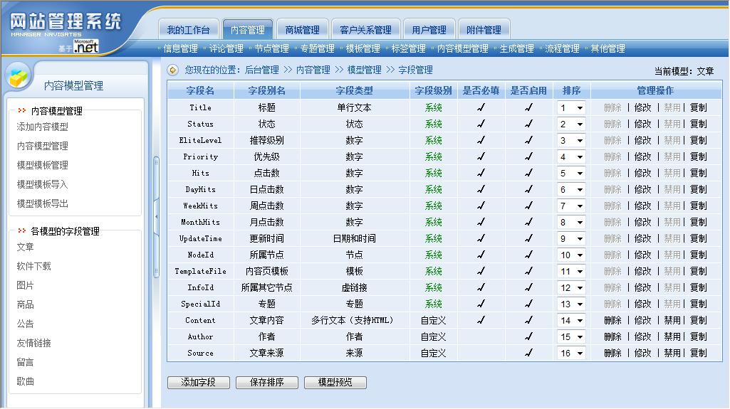 內(nèi)容模型就是將系統(tǒng)原來的“文章”、“下載”、“圖片”、“商品”、“公告”、“友情鏈接”、“留言”、“供求信息”、“房產(chǎn)信息”等功能模塊統(tǒng)一抽象為“內(nèi)容模型”,所有模型的所有字段都可以由站長進行控制。動易CMS 2007版系統(tǒng)會內(nèi)置“文章”、“下載”、“圖片”、“商品”、“公告”、“友情鏈接”、“留言”、“供求信息”、“房產(chǎn)信息”等常用內(nèi)容模型(可能會根據(jù)版本不同而有所區(qū)別)以方便用戶直接使用。站長也可以根據(jù)需要,隨時添加新的內(nèi)容模型,如:可以添加Flash模型、影視模型、音樂模型、課件模型、教案模型……等等,需要什么內(nèi)容模型就可以添加和創(chuàng)建什么內(nèi)容模型。當(dāng)然,站長也可以隨時修改、刪除或禁用系統(tǒng)已有的內(nèi)容模型。對于內(nèi)置的內(nèi)容模型,站長也可以對模型的字段進行管理(包括添加、刪除、修改、排序等管理操作)。