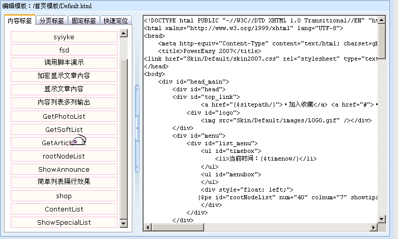 06版本的模板編輯,使用了可視化的在線編輯器,通過右鍵的快捷方式,可以快速的編輯和修改模板和標(biāo)簽代碼,但這種編輯器有一個重大的弱點,就是不夠規(guī)范,它經(jīng)常會自作主張的修改用戶輸入的源代碼,使其不能符合用戶的要求,舉個簡單的小例子: