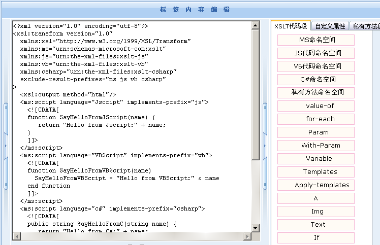 動易 SiteFactory :標(biāo)簽?zāi)0蹇梢允褂肅#,VB, JavaScript和標(biāo)準(zhǔn)的XSLT語句,對數(shù)據(jù)進行處理輸出,下圖中就是同時在標(biāo)簽編輯器里使用三種不同程序語言的示例: