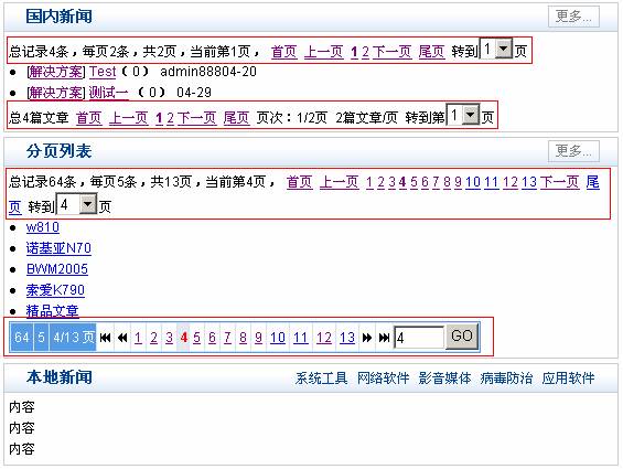 下圖是動易 SiteFactory 實現(xiàn)的同頁面多分頁標(biāo)簽并存的示例,其中紅框標(biāo)出的分頁標(biāo)簽都能對自己的數(shù)據(jù)源標(biāo)簽進行分頁,且互不干擾:
