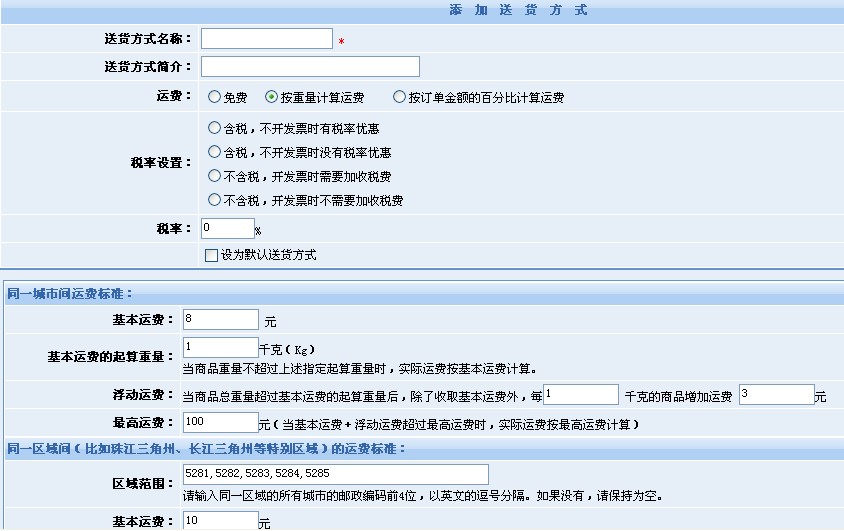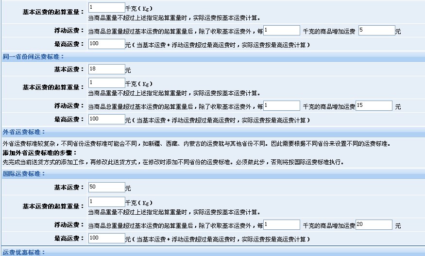 按重量計(jì)算運(yùn)費(fèi)時(shí),可以按同一城市間運(yùn)費(fèi)標(biāo)準(zhǔn)、同一區(qū)域間(比如珠江三角州、長(zhǎng)江三角州等特別區(qū)域)的運(yùn)費(fèi)標(biāo)準(zhǔn)、同一省份間運(yùn)費(fèi)標(biāo)準(zhǔn)、外省運(yùn)費(fèi)標(biāo)準(zhǔn)和國(guó)際運(yùn)費(fèi)標(biāo)準(zhǔn)進(jìn)行設(shè)置,每種運(yùn)費(fèi)計(jì)算方式均可設(shè)置基本運(yùn)費(fèi)、基本運(yùn)費(fèi)的起算重量、浮動(dòng)運(yùn)費(fèi)和最高運(yùn)費(fèi),同時(shí)也可設(shè)置運(yùn)費(fèi)優(yōu)惠標(biāo)準(zhǔn)。