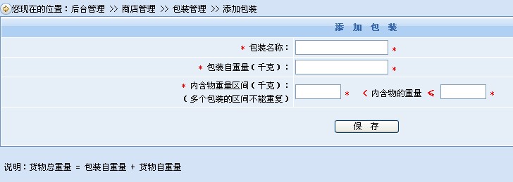 系統(tǒng)還提供了物流包裝的功能,包裝列表信息簡(jiǎn)單明了,支持自定義包裝名稱。下單時(shí)包裝重量可計(jì)算在貨物總重量中(貨物總重量 = 包裝自重量 + 貨物自重量)。