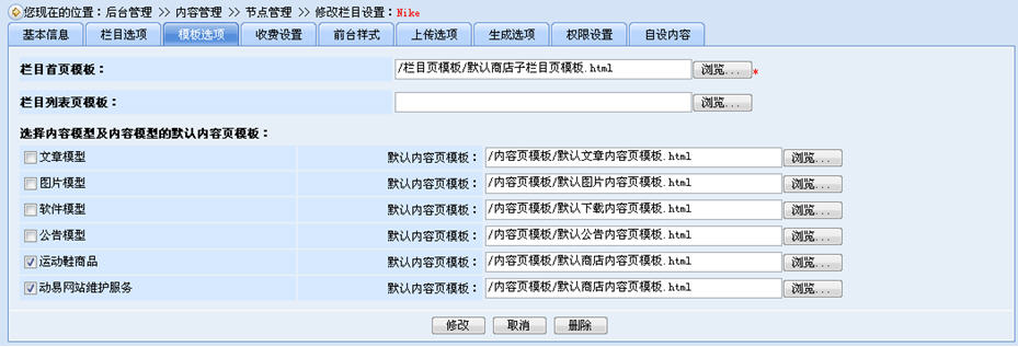 當(dāng)添加完商品模型后,我們還需要為商品添加分類欄目,并指定欄目的商品模型(一定要指定欄目的商品模型,否將不能在該欄目添加商品,一個(gè)欄目可以指定多個(gè)商品模型)。