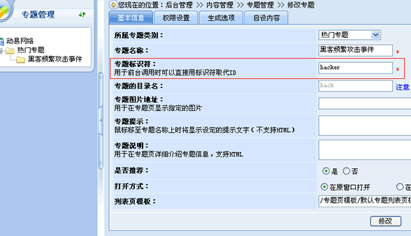 比如我們需要為近期頻繁的黑客攻擊事件進(jìn)行一個專題報(bào)道,于是進(jìn)入專題管理,建立“黑客專題”(如下圖)。特別注意圖中紅色框內(nèi)的內(nèi)容“專題標(biāo)識符”,圖中所示填寫的是“hacker”,那么如果前臺需要調(diào)用所有關(guān)于黑客的文章,只需要在調(diào)用標(biāo)簽中輸入“hacker”即可。