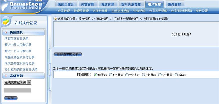 該功能可以讓商家清楚地了解店鋪發(fā)生的每一筆顧客購買商品進(jìn)行在線支付的情況,當(dāng)商家要進(jìn)行顧客支付確認(rèn)的時(shí)候,該功能允許商家根據(jù)支付時(shí)間、用戶名或在線支付編號(hào)進(jìn)行交易支付記錄的快速檢索。此外,動(dòng)易eShop2007也內(nèi)置了一些常用的條件查詢功能菜單,如查詢“所有的記錄”、“最近10天的記錄”、“最近一個(gè)月的記錄”、“未提交的在線支付記錄”、“未成功的在線支付記錄”等,以方便商家快速了解網(wǎng)店顧客購買商品的支付情況,更高效地進(jìn)行網(wǎng)店的收款管理。