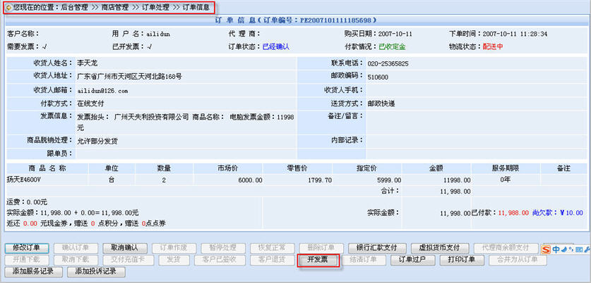 在動(dòng)易eShop2007里,為顧客開發(fā)票是通過這個(gè)步驟進(jìn)行的:后臺(tái)管理——商店管理——訂單處理——訂單信息——開發(fā)票。