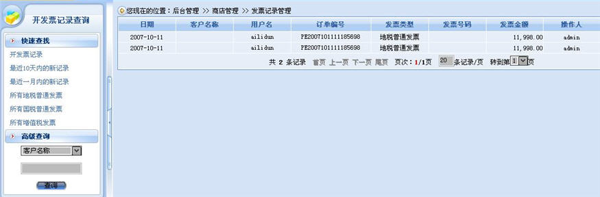 系統(tǒng)提供了快速查找功能,預(yù)置了一些常用查詢。除了可以通過時(shí)間進(jìn)行查詢之外,還可以對(duì)開票的類型進(jìn)行查詢,另外,在高級(jí)查詢功能中,商家可以指定“客戶名稱”、“開票人”選、“開票日期”,來進(jìn)行查詢,而不用從訂單中來查看開票的信息,極大的提高財(cái)務(wù)發(fā)票管理的效率。