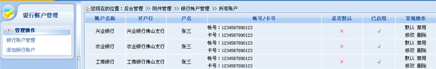 銀行帳號(hào)的管理非常的簡(jiǎn)單,操作步驟如下:進(jìn)入后臺(tái)管理——商店管理——商店設(shè)置——銀行帳號(hào)管理。
