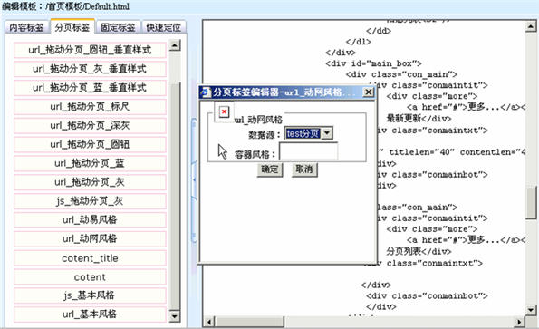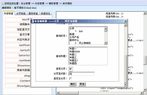 首先,我們進(jìn)入到首頁(yè)模板編輯模式,為模板添加內(nèi)容標(biāo)簽。內(nèi)容標(biāo)簽是用于……。我們將名為“test分頁(yè)”的內(nèi)容標(biāo)簽拖拽到右邊的模板編輯框的相應(yīng)位置。然后系統(tǒng)會(huì)彈出標(biāo)簽編輯器的對(duì)話框,在這個(gè)對(duì)話框里,我們可以設(shè)定內(nèi)容查詢的欄目、專題、選擇分頁(yè),分頁(yè)顯示數(shù),勾選是否主分頁(yè)等,如下圖: