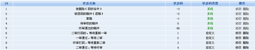 稿件狀態(tài)碼很顯然的是用于顯示稿件當(dāng)前的處理狀態(tài)的:是待審核的稿件,還是已經(jīng)通過審核的稿件?這樣便使得用戶可以清楚的了解到所投稿件正處在什么審核狀態(tài),對(duì)于網(wǎng)站編輯來說,也可以提醒自己是否有未處理的稿件,并讓稿件按既定的流程順序進(jìn)入下一個(gè)審核環(huán)節(jié)。