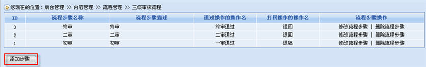 在添加步驟的頁面里,我們根據(jù)所設(shè)計(jì)的三級(jí)審核流程來指定該步驟的各種參數(shù),如:步驟名稱、可執(zhí)行本步驟的角色、哪種狀態(tài)的稿件可以執(zhí)行本步驟的操作、通過(不通過)該步驟的操作的命名、通過(不通過)該步驟的稿件狀態(tài)等。
