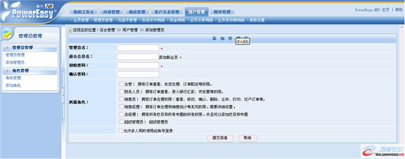 3.一個管理員可以屬于多個角色,一個角色也可以屬于多個管理員。如一個銷售經(jīng)理可以同時屬于銷售人員和財務(wù)人員的角色,財務(wù)人員的角色也可以分配給銷售經(jīng)理和總經(jīng)理。