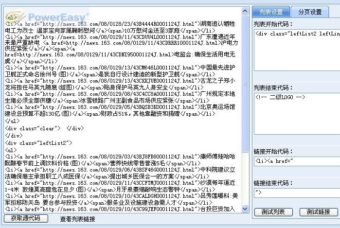 這里說的即時(shí)顯示指的是無刷新即看見采集的效果,所有的采集規(guī)則都可以通過AJAX效果進(jìn)行預(yù)覽。比如我們采集 的國內(nèi)新聞列表,當(dāng)我們?cè)O(shè)置好列表采集規(guī)則后,點(diǎn)擊“測試列表”和“測試鏈接”我們就可以直接在左邊預(yù)覽到采集后的效果(如下圖)。