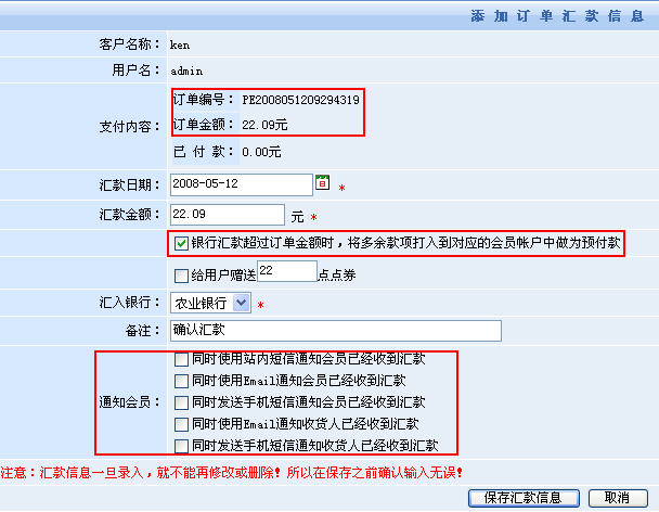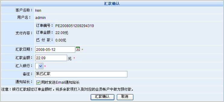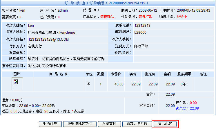另外一個匯款確認(rèn)的功能按鈕則是為商品訂單獨立設(shè)計的:會員的訂單信息——>點擊“我已匯款”按鈕——>添加該筆訂單的匯款確認(rèn)信息,見下圖: