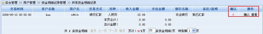 會員顧客發(fā)出匯款確認(rèn)信息后,網(wǎng)店管理員登錄后臺后可前往商店管理——>明細(xì)記錄——>資金明細(xì),查看到這條匯款確認(rèn)的記錄并可進行確認(rèn)操作,見下圖: