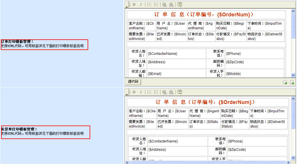 在網(wǎng)站后臺的商店模板配置里,我們能夠根據(jù)自己業(yè)務(wù)實際情況來設(shè)計相應(yīng)的訂單與發(fā)貨單的打印模板。設(shè)計方式非常簡單,支持可視化編輯,建立相應(yīng)的表格后在需要的位置里加入相應(yīng)的標(biāo)簽即可。簡單的是最好的,不是嗎?:)因為支持html代碼,你還可以發(fā)揮自己在網(wǎng)頁技術(shù)的特長,把公司logo等內(nèi)容加到相應(yīng)的位置,設(shè)計出非常正規(guī)的訂單或發(fā)貨單。