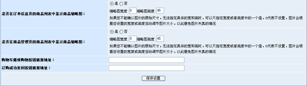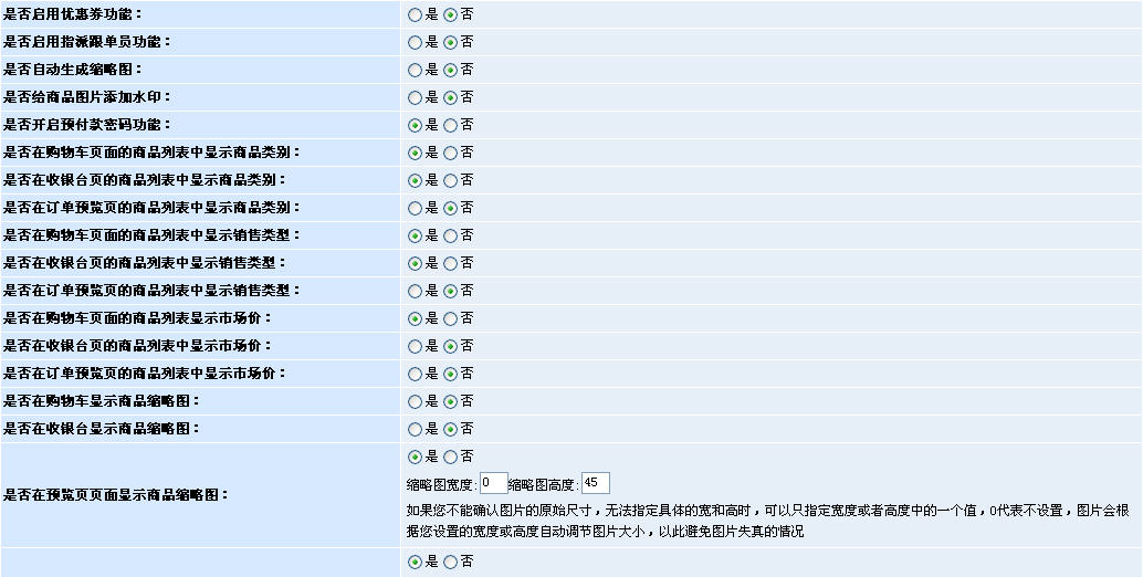 圖2。通過(guò)上圖我們發(fā)現(xiàn),這部分內(nèi)容主要是實(shí)現(xiàn)了對(duì)商店實(shí)際的業(yè)務(wù)運(yùn)作過(guò)程中的操作界面的管理控制,如訂單預(yù)覽、購(gòu)物車(chē)、收銀臺(tái)等頁(yè)面。而歸結(jié)起來(lái),主要管理的功能有以下幾點(diǎn):1、是否允許商品縮略圖的顯示;2、是否允許顯示商品類(lèi)別;3、是否顯示銷(xiāo)售類(lèi)型。通過(guò)這些設(shè)置,我們就能夠根據(jù)實(shí)際的需要,決定購(gòu)物車(chē)、訂單等頁(yè)面的商品列表效果。這樣的好處也很簡(jiǎn)單,就是讓商家能夠根據(jù)商店商品的特性,自行選擇合適的效果,比如:點(diǎn)卡類(lèi)商品的訂購(gòu)列表就是不需要有縮略圖的,而服裝類(lèi)的商品則往往希望有縮略圖。