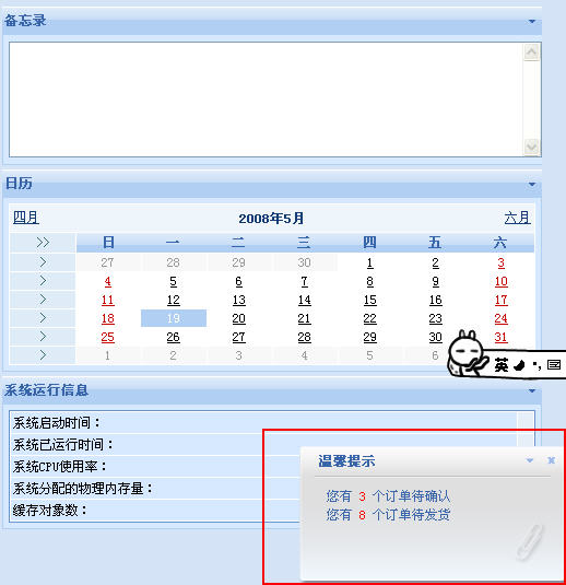 只要再過一兩個星期,大家就能親自體驗這個功能了:當(dāng)我們安裝完畢SiteFactory CMS/eShop 1.1后,一登錄后臺就會發(fā)現(xiàn)有個提示框從右下角動態(tài)彈出,消息框?qū)⑾蛭覀兞谐鲂畔ⅲ耗卸嗌倨恼挛磳徍?、多少訂單未處理、多少發(fā)貨未處理……等等。