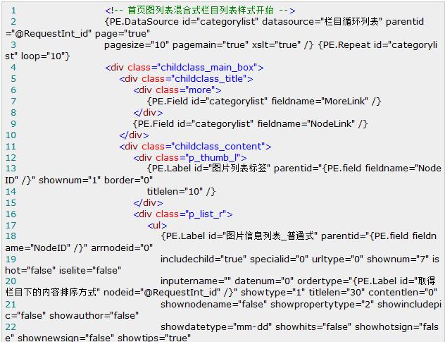 如上圖我們要實現(xiàn)每兩個欄目就加入一個廣告圖片,如何實現(xiàn)呢?首先我們打開SiteFactory? CMS 1.1的“圖片首頁模板”,在代碼中找到欄目循環(huán)開始的地方,代碼如下: